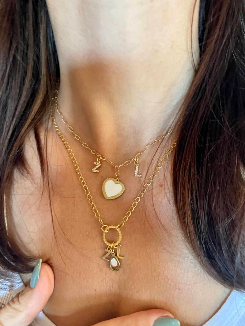 Délicate chaîne en acier inoxydable, avec un coeur dont l'intérieur est en coquillage, ainsi que 2 lettres en pierre de zirconium.